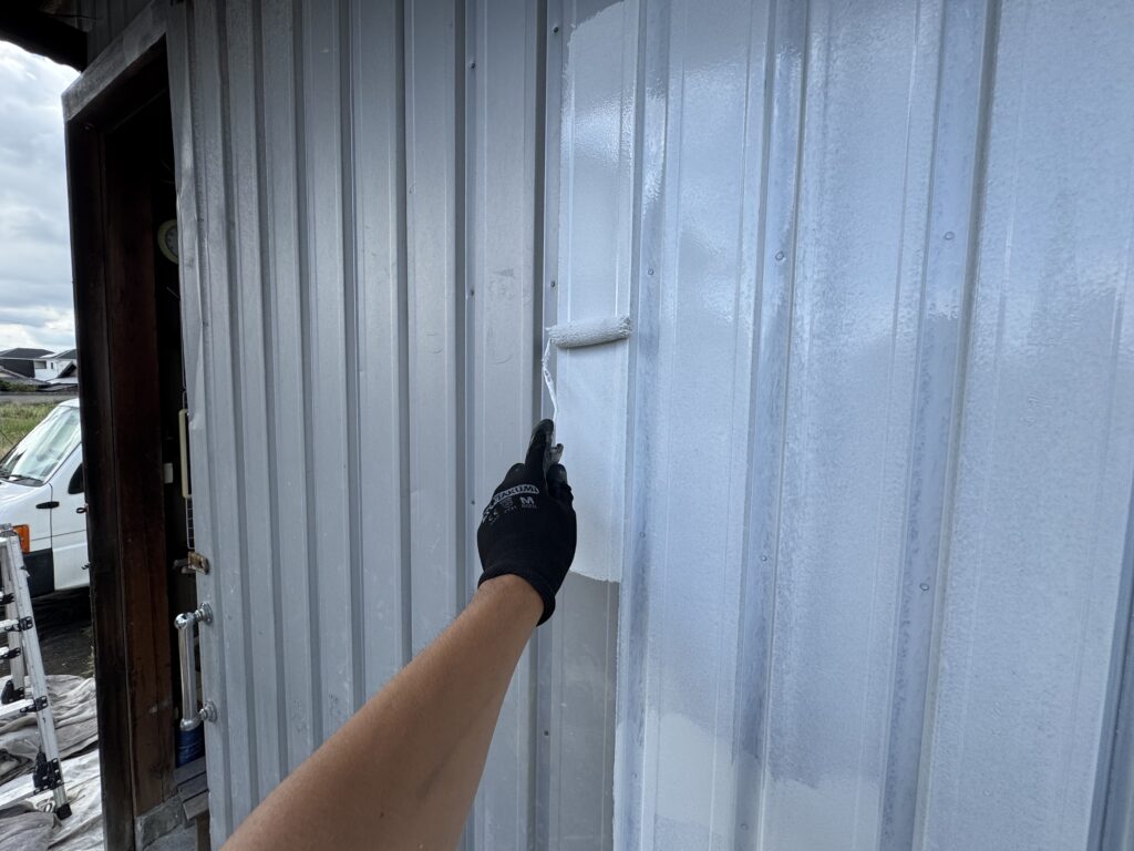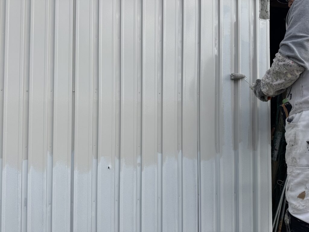 トタン外壁のため丁寧な研磨後、錆止め(ハイポンファインデクロ)を塗装、上塗りにはファインパーフェクトトップsiを塗装👍