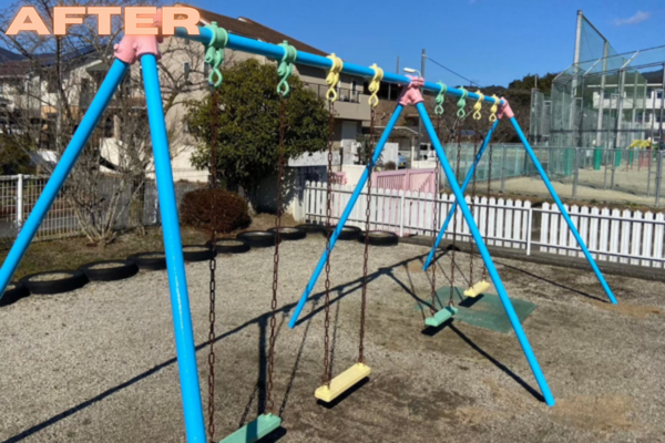 子どもたちが触れるもののため、手触りを良くするようサンダーで丁寧に研磨し、錆止めの下塗り後、上塗りを2回重ねて計3回塗りで仕上げました。